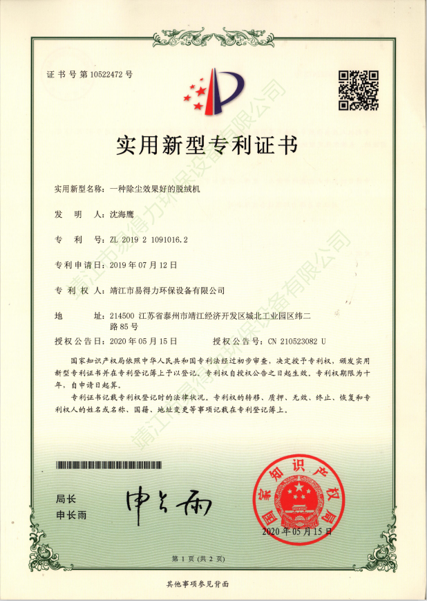 專利證書本公司坐落于開放開發(fā)超前城市江蘇靖江,我們精良優(yōu)秀設計團隊始終遵循著創(chuàng)新超越的理念,贏得了中外合資企業(yè)的信賴。易得力環(huán)保設備有限公司與上海環(huán)科院等科研單位保持合作關系,不斷加大自身的科研力量,集中了一批國內(nèi)環(huán)境科技研究和應用方面的高素質(zhì)人才,取得多項實用新型專利證書。…… 查看更多 >>